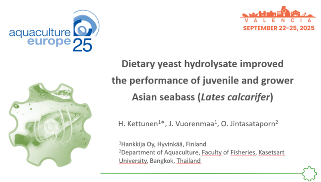 Hankkija Finnish Feed Innovations contributed to AE2025 with a presentation by our R&D Manager Hannele Kettunen, highlighting the benefits of Progut® Extra yeast hydrolysate on the performance of Asian seabass.
