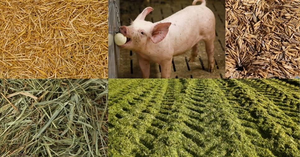 Suitable enrichment materials must be safe, malleable, and attractive for pigs to interact with and consume. Straw, hay, and silage are widely recommended and considered effective options.